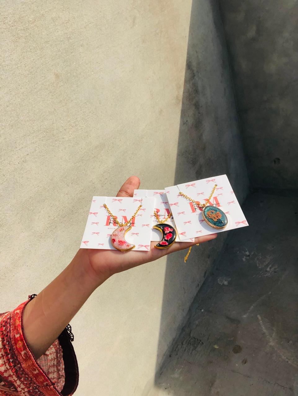 resin pendent >made by real flower also you can coustmize then with different shape and colours made with satinless base and chains available in silver and golden oth chains also you can preserve your special 💐 flowers in them